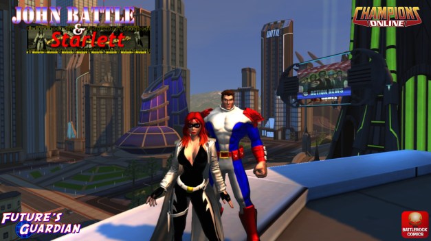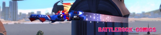 The second features John Battle doing a flyby past Millennium City’s City Hall building, with the American Flag trailing his Patriot cycle. John Battle’s heritage is mixed Native American and French, making him a true child of America. And, as you can see, he’s not ashamed of being an American.