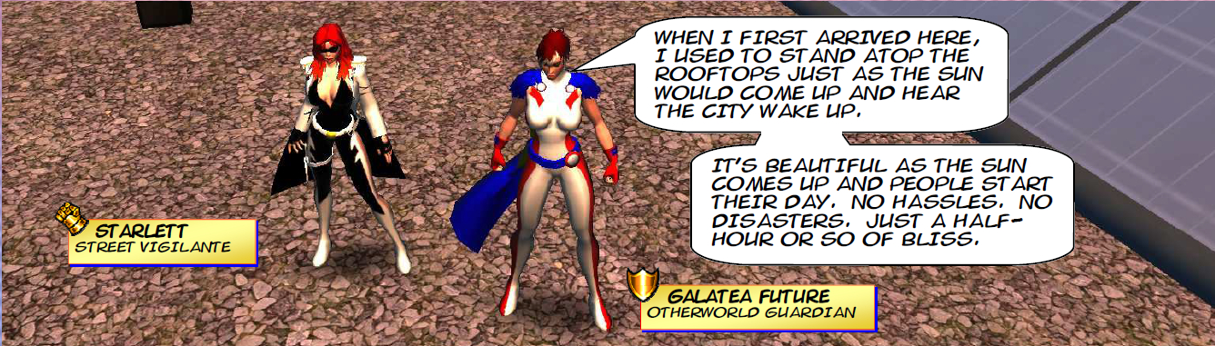 The idea of Galatea “standing watch” over the city is a common theme for the character in pretty much any universe she is in.