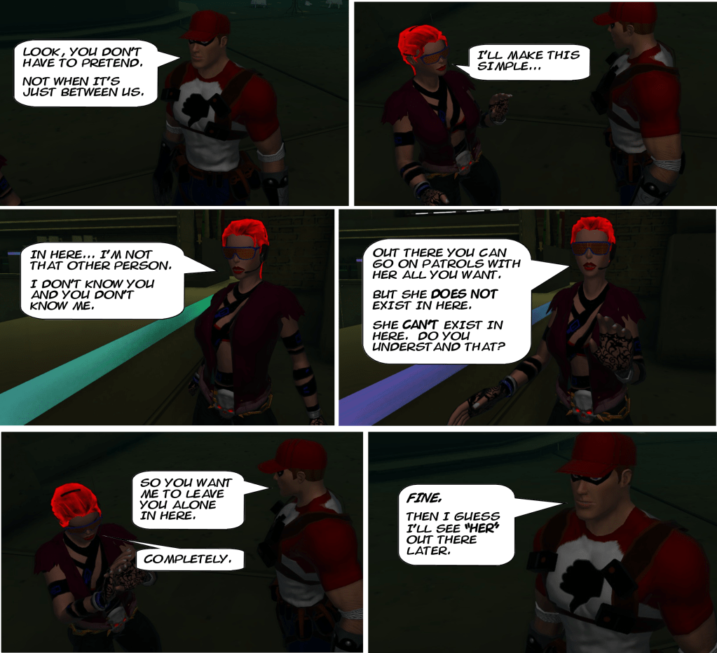 Think about Galatea Future. For most of her life before she went to the world of Champions Online, she really didn’t have a secret identity, because she didn’t have a personal life outside of who she was as a hero. Yes, in those early years in “The City”, she had a secret identity as a tailor apprentice, but that ended up being scuttled when she disappeared for five years and her civilian identity was presumed killed. After that, she was simply “Galatea” That’s what that whole universe knew her as.. Then, after she arrived in the world of the Champions, she was given a new civilian identity of Athena Rose Fairmore, but even that is a disguise for who she really is.